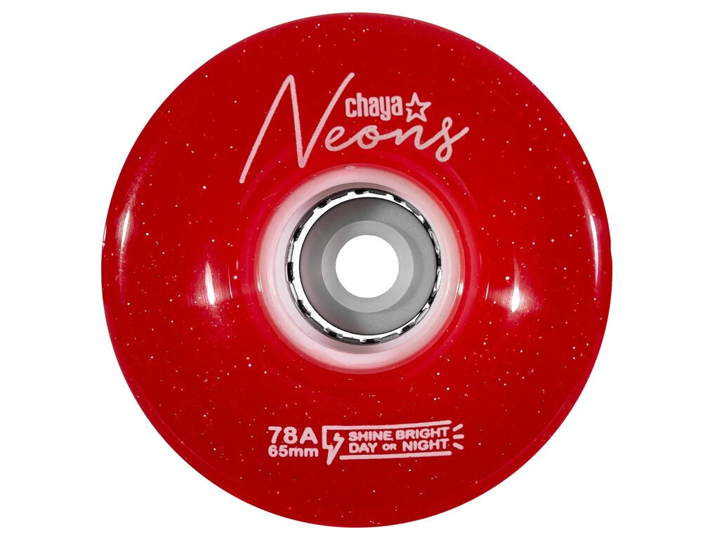 Set of four Chaya Neon’s LED Light Up Roller Skate Wheels in Red 65mm 78a. Powered by a Dynamo these light up wherever you roll. Like the Luminous light up wheels these provide a super bright and smooth glow.