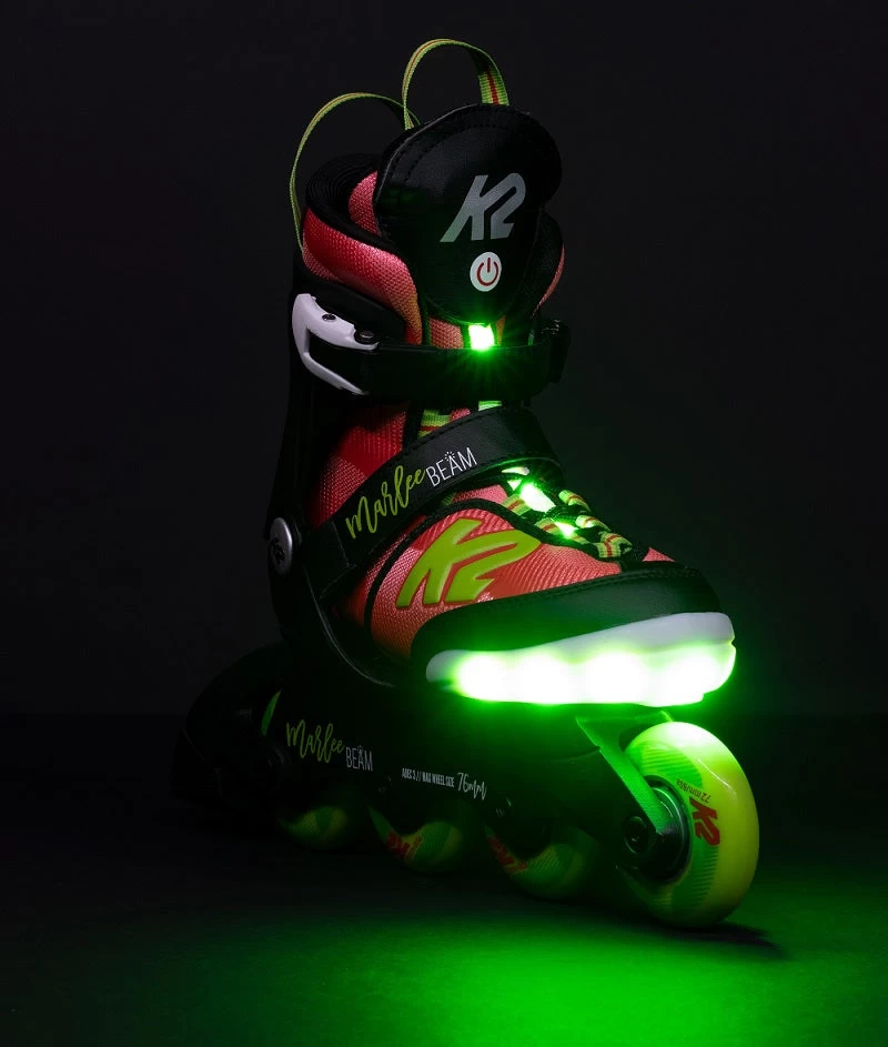 These are the new K2 Marlee Beam Adjustable Size Skates in Pink. These feature a set of lights integrated into the toe and tongue that are powered by replaceable batteries. Amazing for skating at night and incredibly fun for kids.