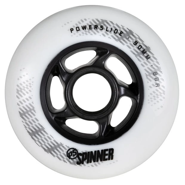 Set of 8 Powerslide Spinner White Wheels in 90mm 88a. Spinner wheels make a great replacement or upgrade set of wheels, coming in fairly hard at 88a they roll fast and are nice and durable.