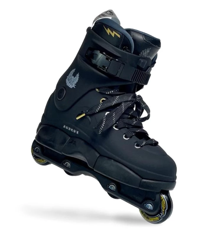 The Nico Auroux Pro SL Skates come complete with Premium Razors Liners, Aluminium Razors Buckles, Waxed Hockey Laces with Reflective Flakes and Gold Metallic Lace Tips, GC FLT3 Frames with Chrome Sickle Axles, GC 60mm/90A Bullet Wheels (setup anti-rocker), ABEC9 Bearings and Shift/SL Heel pad, and 3M Reflective Carry Strap.