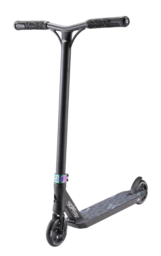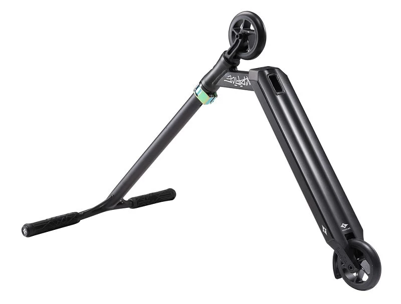 This is the Sacrifice Flyte 100 V2 Stunt Scooter in Black and Neo which is one of the lightest completes you can buy weighing just 2.8 kgs. With its 56.5cm high bars the Flyte 100 is designed for younger riders who want a top of the range scooter.