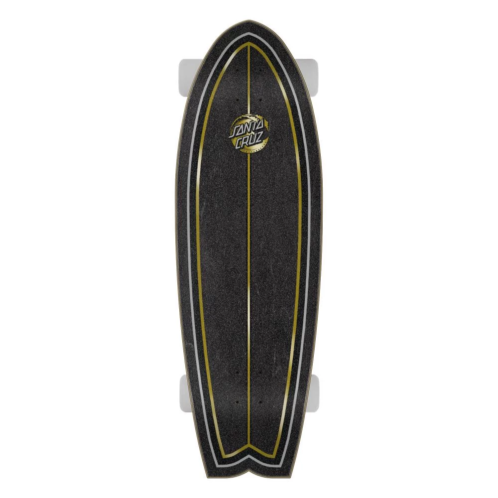 Santa Cruz Holo Wave Dot Shark Cruiser featuring prismatic foil graphic on 7 ply surfboard inspired shape with 140mm Bullet trucks, angled risers, and 65mm 78a wheels.